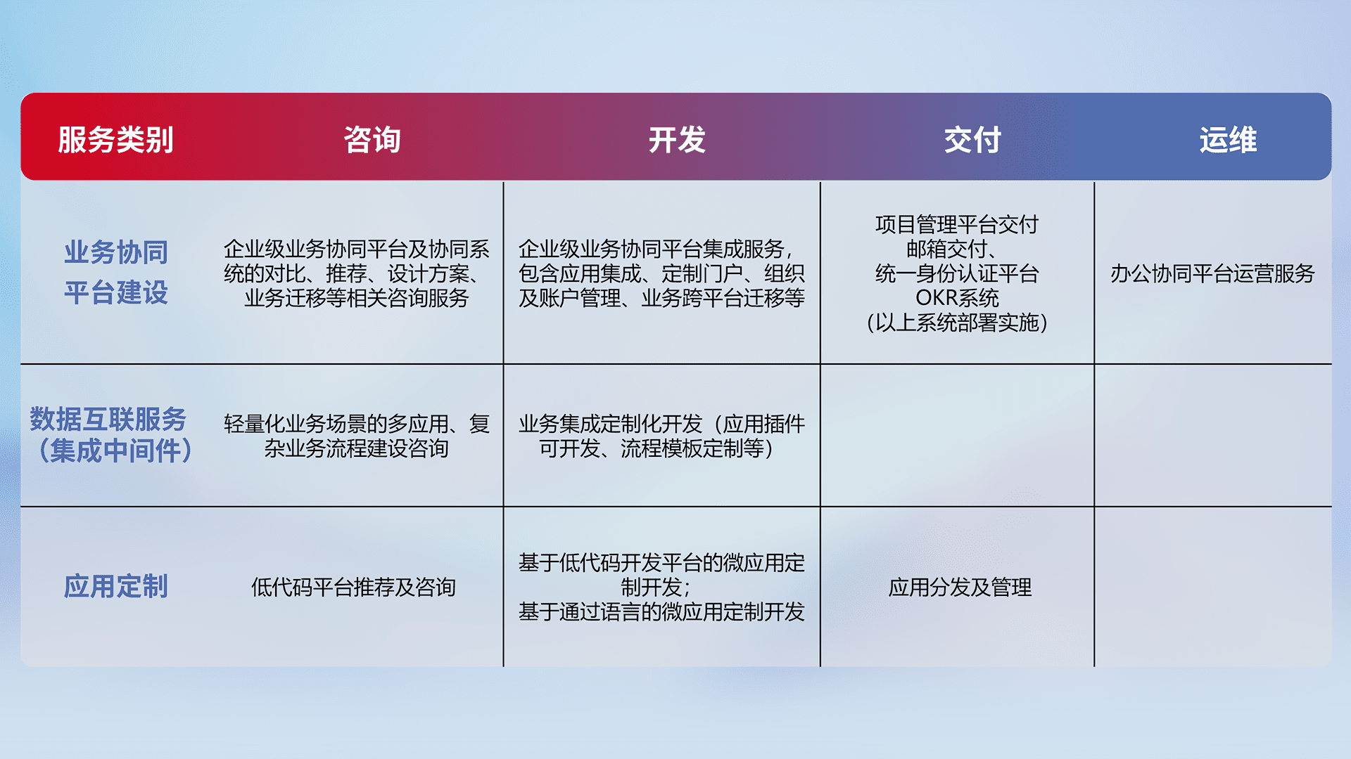 针对钉钉、、、企微、、、、IDaas等平台级产品提供产品的规划、、、、方案、、交付、、、、定制化开发等服务,,,实现如统一协同办公、、、、智能客户服务、、、、混合会议管理、、、智能数据查询、、等业务场景,,,,实现数字化转型。。。
